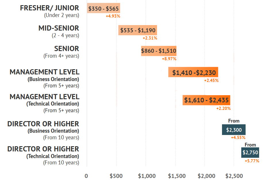 5年目以降なら、給与の差は主に役職と業務上の責任によって変わります。ディレクター以上のレベルになると、少なくとも2,300ドル以上の給与です。また エンジニア志向の管理職の給与は、一般管理職の給与よりも高くなります。