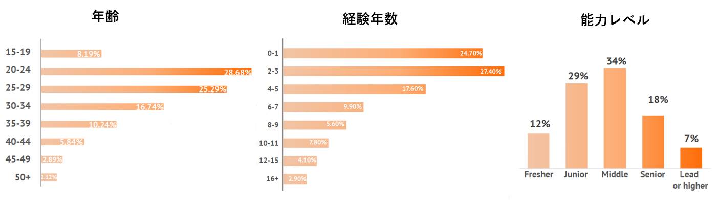 一方、5年以上の経験がある開発者は約30%ですが、経験3年未満の開発者は52.1%を占めています。その結果能力レベルでは、まだ発展途上の開発者は40%を超えており、中堅レベルの開発者は34%、ハイレベルの開発者は18%です。