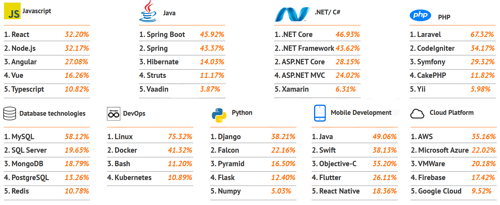 SQL技術スタックでは、MySQLが58%以上のシェアを占め、引き続きトップを維持しています。しかし、その他のSQLシステムの人気にはそれほど大きな違いはありません。上位5つ(MySQL、SQL Server、PostgreSQL、MongoDB、Redis)は、どの開発においても、データベース機能の重要性は同じです。Python は昨今技術の世界で、最も人気のある開発言語の1つとされていますが、Djangoフレームワークが38.21%を占めているのに対し、5位のNumpyは5.03%にとどまっています。