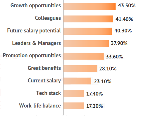 調査に参加した開発者の回答によると、現在のIT企業に従事する主な理由は、会社の成長性(43.5%)、会社の同僚などの雰囲気(41.4%)、昇給への期待(40.3%)などです。その一方、仕事と生活のバランスは最も回答が少なく、17.2%に止まっています。