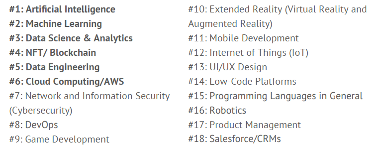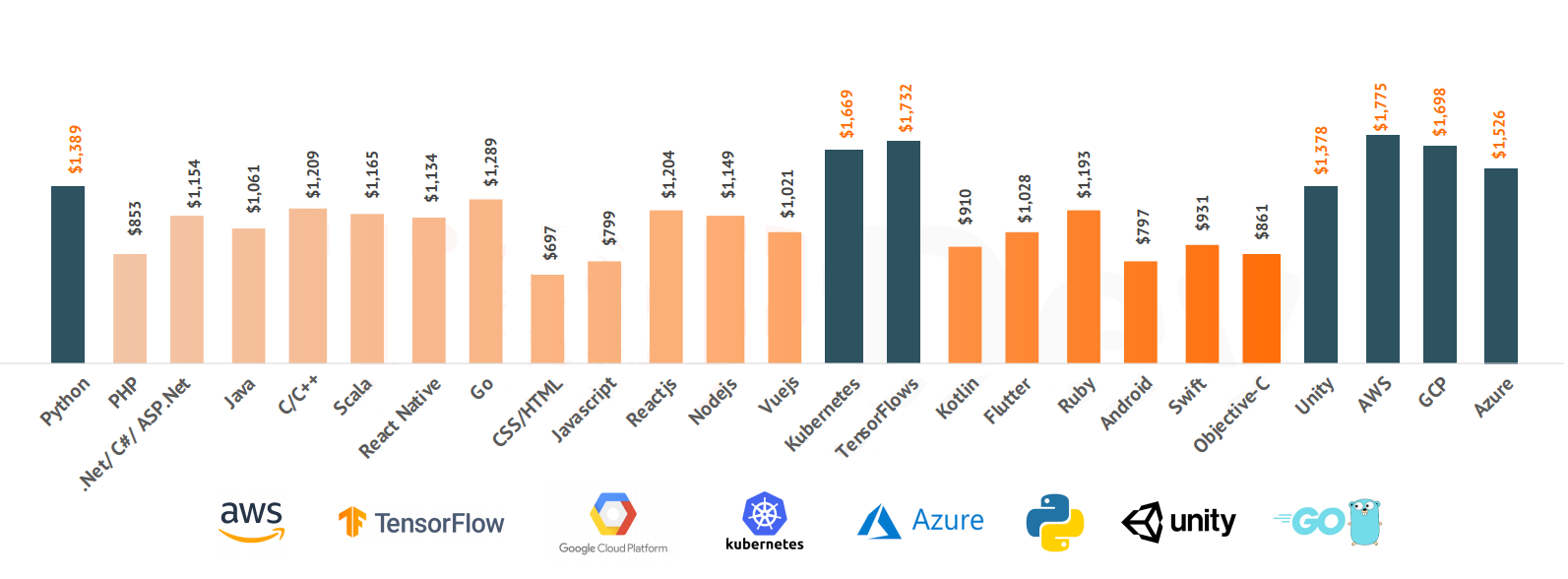 最も給与が高い技術者は、AI・機械学習のトレンドに関連する技術者(Kubernetes、TensorFlows、Python)とクラウドコンピューティング(AWS、GCP、Azure)の2つです。また、今年は、Play-to-EarnやNFTがトレンドのため、Unityが初めてランクインしました。