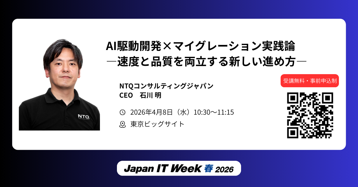 NTQジャパンは「Japan IT Week 春 2026」に出展し、AI駆動型開発による高速・高品質なシステム開発を紹介。生成AIを活用した要件定義やモダナイゼーション、E2Eテスト自動化のデモを実施。さらに「AI駆動開発×マイグレーション」をテーマとした特別セミナーも開催します。