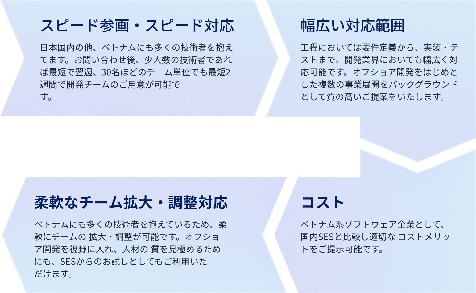 SESのメリットはたくさんありますが、主に「必要なスキルを持つエンジニアを迅速に確保できる」ことや「柔軟なリソース調整」といえます。